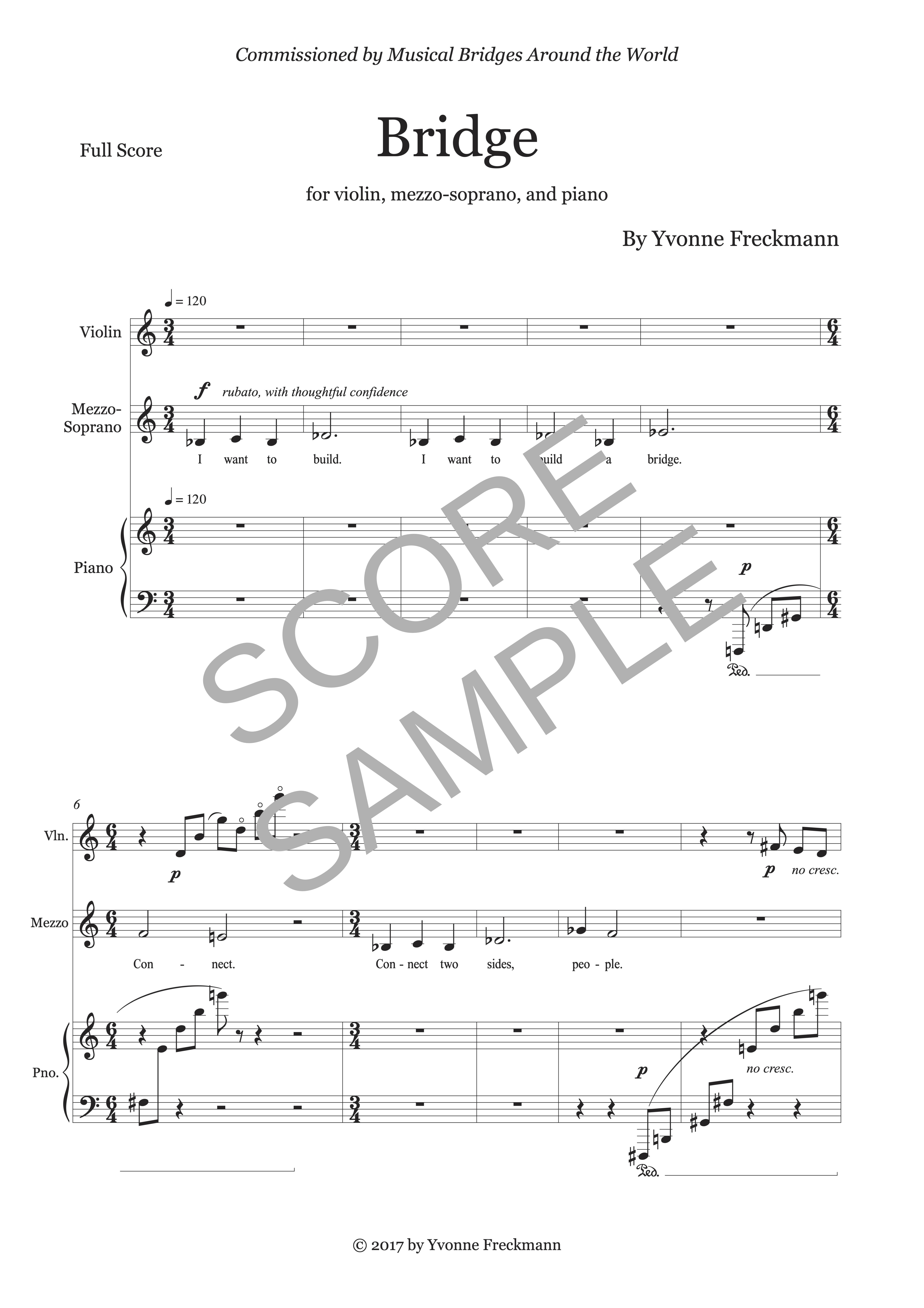 When Musical Bridges Around the World commissioned me to write a piece for their 20th anniversary, I thought back on my time spent attending concerts, turning pages for the professionals, and also performing and acting with my sister in the “Child Prodigy” concerts as a teen. Studying piano with Anya Grokhovski was a formative experience and I loved the immersion in her musical family. So for an anniversary, what better way than to examine the name of the organization itself, carefully chosen. I began to think about bridges, the building of them, the planning, architecture and daring human activity that connects. The vision that bridge-building entails, the needs and the symbolism of place. How bridges add to the beauty of their surroundings. How bridges become symbolic of the locations or cities they connect, which fit perfectly with the request to make the piece about homecoming, the journey to a deeply familiar place. For the musicians and myself a homecoming to San Antonio, Texas for the premiere, and for the (hopefully) cherished feeling for everyone coming home. The piece has a duration of about ten minutes.